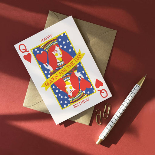 Afficher tous les détailsEen leuke en koninklijke verjaardagskaart met een grafisch speelkaartontwerp en de feestelijke boodschap "Fijne Verjaardag, Koningin voor een Dag!"...